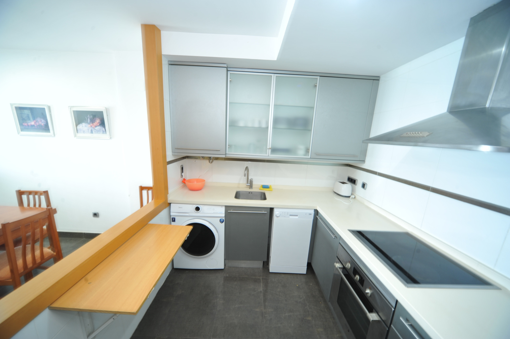 La cocina americana está completamente equipada con nevera, congelador, lavavajillas, microondas, horno y cafetera. Ideal para preparar deliciosas comidas durante tu estancia.